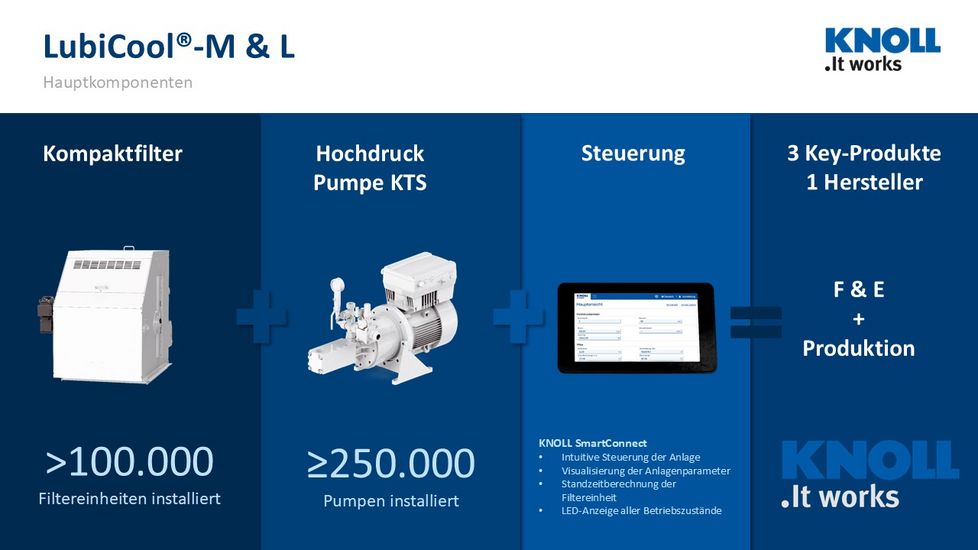 Zweitens versorgt der LubiCool®-M die Drehmaschine mit Hochdruck. „Dafür setzen wir eine KNOLL KTS-Schraubenspindelpumpe ein, die bis zu 150 bar Druck und einen Volumenstrom bis 30 l/min zur Verfügung stellt“, erwähnt Matthias Wachter. „Von der KTS-Pumpe produzieren wir 12.000 Stück im Jahr. Sie hat sich also vielfach bewährt und gewährleistet eine extrem hohe Standzeit sowie Prozesssicherheit.“