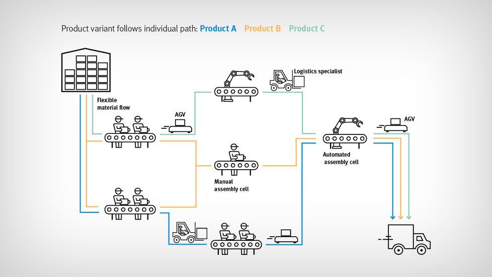 The demands placed on production today are diverse: Flexible production systems, different variants and efficiently scalable lot sizes. Matrix production as cycle-independent line production combines the flexibility of individual production with the economic benefits of classic line production.
