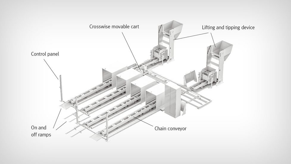 The machine operator pushes the chip carts from the machine to the processing facility. After feeding the chips into one of two available feed conveyors, the employee records which chips are inside by using a barcode. The disposal process then starts automatically. The chips can now be handed over to the recycling company dry and sorted by type. This is reflected in higher remuneration.