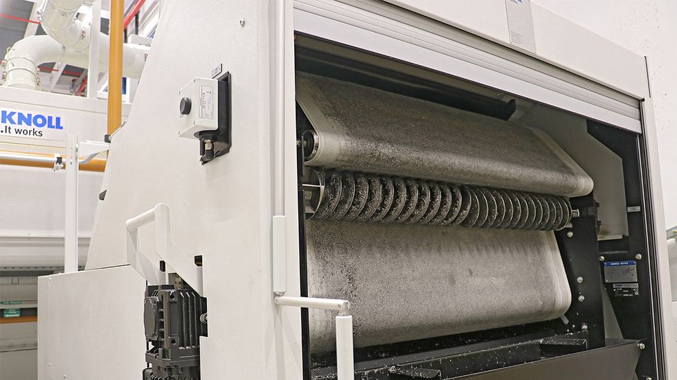 Le système KNOLL est installé dans une annexe séparée du hall, pour garantir le moins de bruit possible dans la zone de production. « Cette solution a déjà fait ses preuves avec les systèmes de refroidissement centralisé existants », argumente Mme Braun, cheffe de projet. Sur une surface d’environ 190 m2 sont désormais installés le réservoir d’eau usée de 40 m3 équipé d’un convoyeur à bande racleuse et un réservoir tampon de la même taille pour les gros travaux de maintenance. Outre les pompes, filtres et autres composants, on y trouve également un poste de stockage temporaire automatisé pour les bacs de collecte des copeaux.