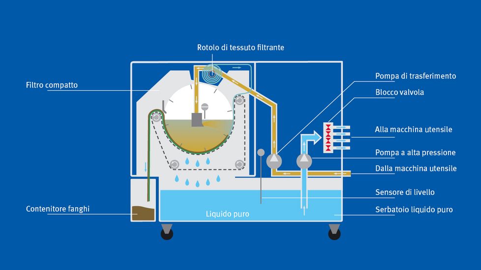 Filtraggio efficiente tramite filtro a nastro | • Accumulo ridotto di particelle fini • Elevata durata dei componenti e del lubrorefrigerante (KSS) |