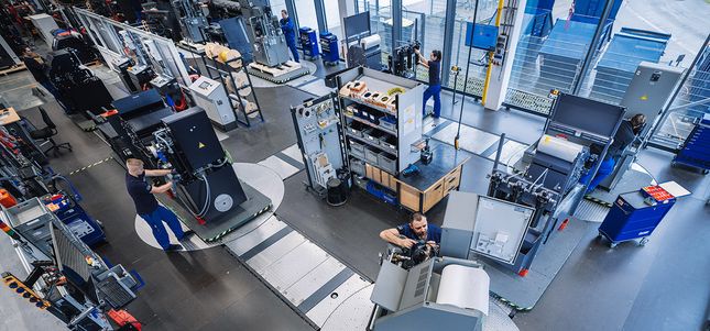 Unser Geschäftsbereich Automatisierung beschäftigt sich mit Lösungen für anspruchsvolle Montage- und Logistikaufgaben. Hierzu gehören stationäre Transportsysteme mit Ketten- und Rollenförderern. Sie werden ergänzt um Industrieroboter und fahrerlose Transportsysteme (FTS).