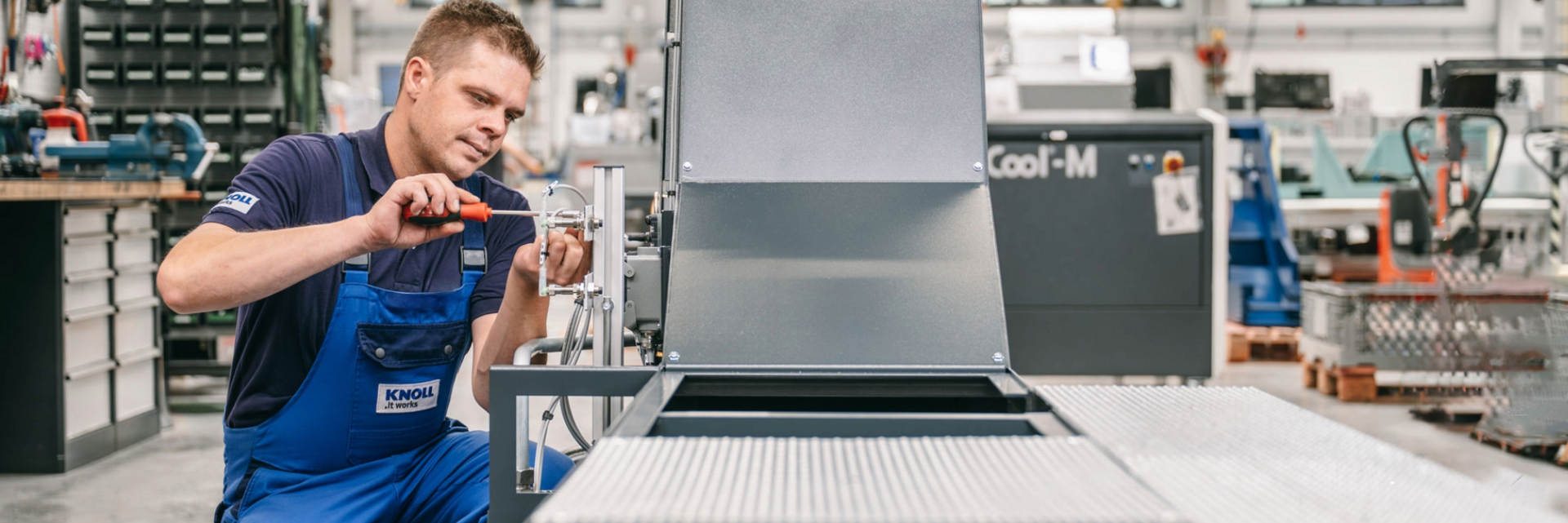 KNOLL Kratzbandförderer SF sind Anlagen zum Sammeln und Trennen von Spänen und Kühlschmierstoffen (KSS). Für eine noch bessere Aufbereitung des KSS kann zusätzlich ein Filtrationsprozess integriert werden.